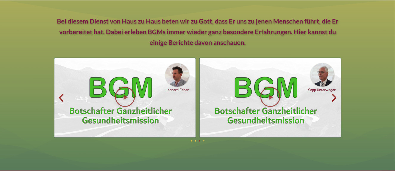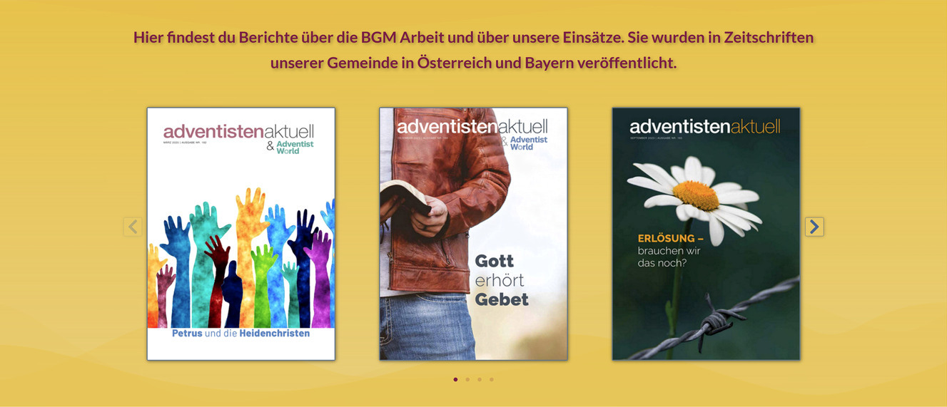 Dieses Karussell zeigt Auszüge aus Zeitschriften unserer Gemeinde mit Berichten über die BGM Arbeit. Ein Klick auf ein Titelbild öffnet eine Lightbox, in der man die Berichte komfortabel lesen kann. Durch einen Klick auf das Lupensymbol innerhalb der Lightbox lässt sich das Bild bzw. der Text vergrößern.