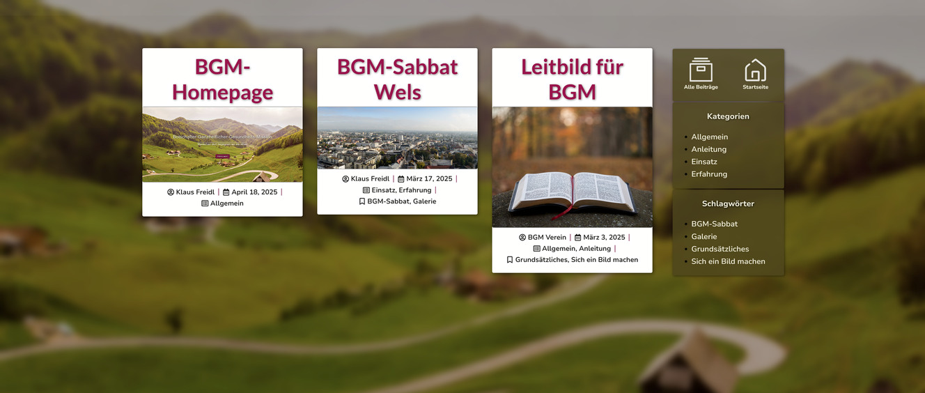 Hier findest du eine kleine Übersicht über den Aufbau der BGM-Homepage. Sie ist so aufgebaut, dass du alle Abschnitte entweder durch Scrollen oder über das obere Menüband erreichen kannst. Nur die Blog-Beiträge befinden sich auf einer eigenen Seite, die du über den Menüpunkt ‚Beiträge‘ aufrufen kannst.