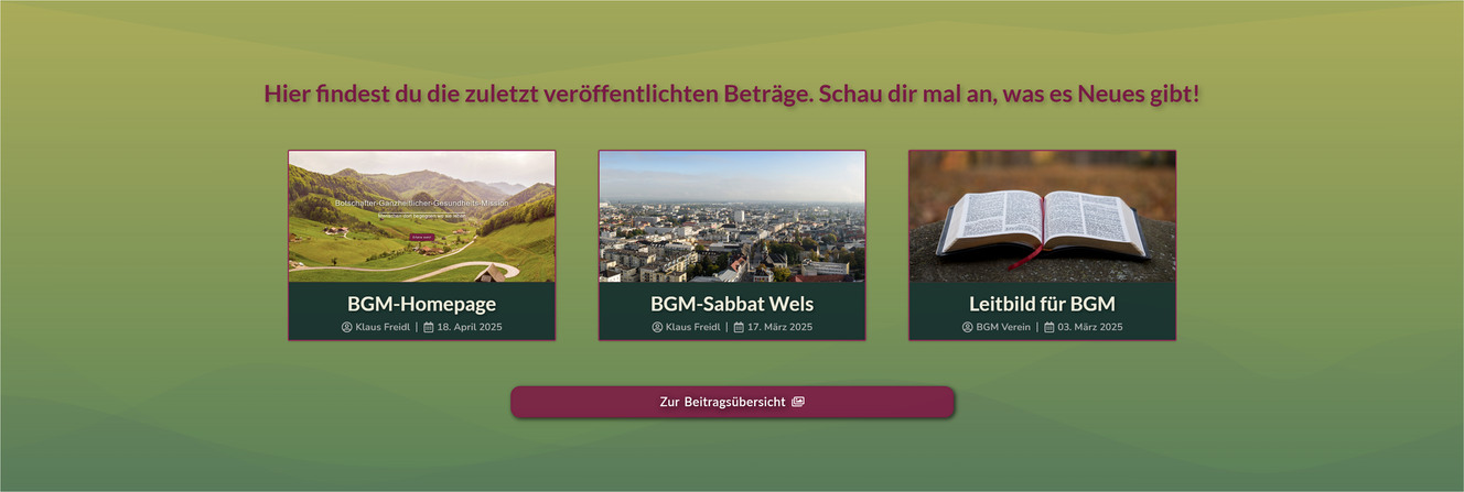 Mit der Zeit werden immer mehr Beiträge zusammenkommen. Im letzten Abschnitt der Hauptseite werden die drei neuesten vorgestellt. Ein Klick auf einen Beitrag öffnet diesen direkt. Mit dem Button darunter gelangt man zur Übersicht aller Beiträge.