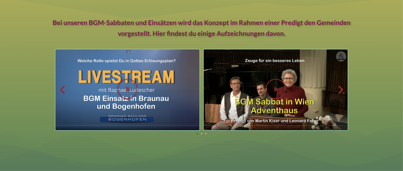 Hier laufen in einem ‚Karussell‘ Videovorschaubilder. Beim Klick auf ein Vorschaubild öffnet sich das Video in einer Lightbox. Es sind Aufzeichnungen von Gottesdiensten.