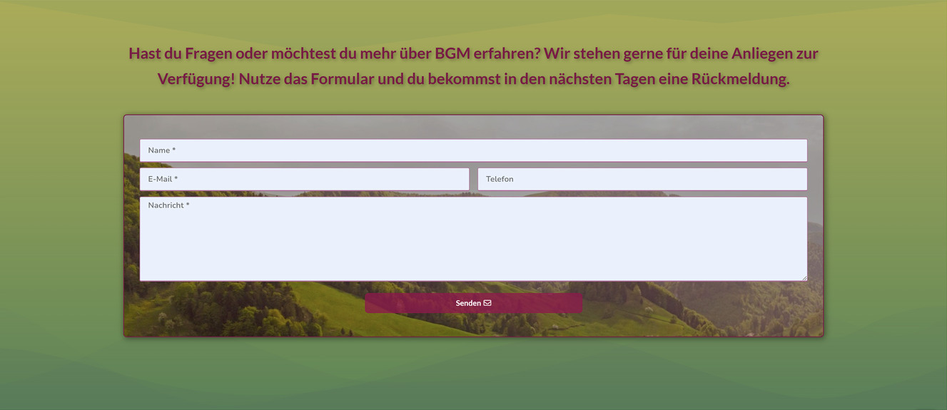 In diesem Abschnitt steht ein Kontaktformular zur Verfügung, über das Fragen oder Anliegen an unser BGM-Team gesendet werden können. Damit das Formular versendet werden kann, sind Eingaben in den Feldern Name, E-Mail und Nachricht erforderlich. Das Feld Telefon ist optional. Nach dem Absenden erhält die absendende Person eine Kopie der Nachricht per E-Mail.