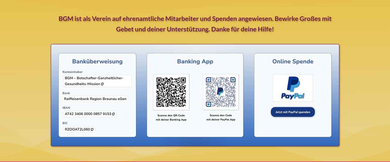 Der Spendenbereich bietet verschiedene Möglichkeiten zur Unterstützung. Im Abschnitt Banküberweisung lassen sich IBAN und BIC mit einem Mausklick in die Zwischenablage kopieren und anschließend bequem im E-Banking verwenden. QR-Codes ermöglichen eine komfortable Spende per Smartphone-App. Am schnellsten und einfachsten funktioniert das Spenden über PayPal.
